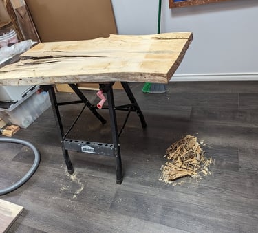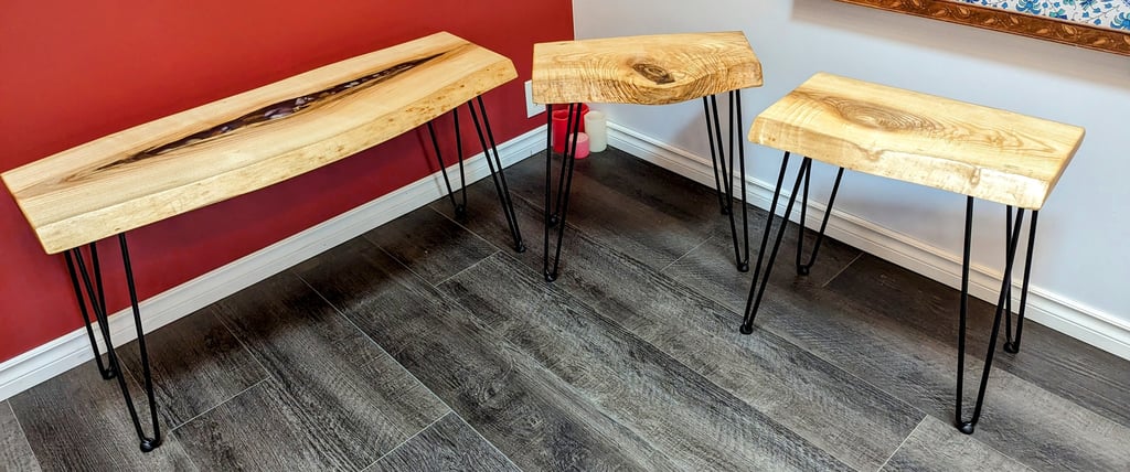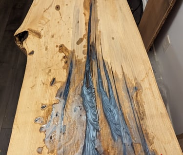 The coffee table and end tables made out of elm wood and accented with epoxy create a stunning blend of natural beauty and contemporary design. Crafted with precision and attention to detail, these pieces are sure to elevate any living space.