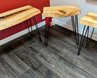 Accents of epoxy add a modern twist to the design. Carefully applied in the centre of the coffee table, the epoxy accents lend a unique and eye-catching element to the tables.